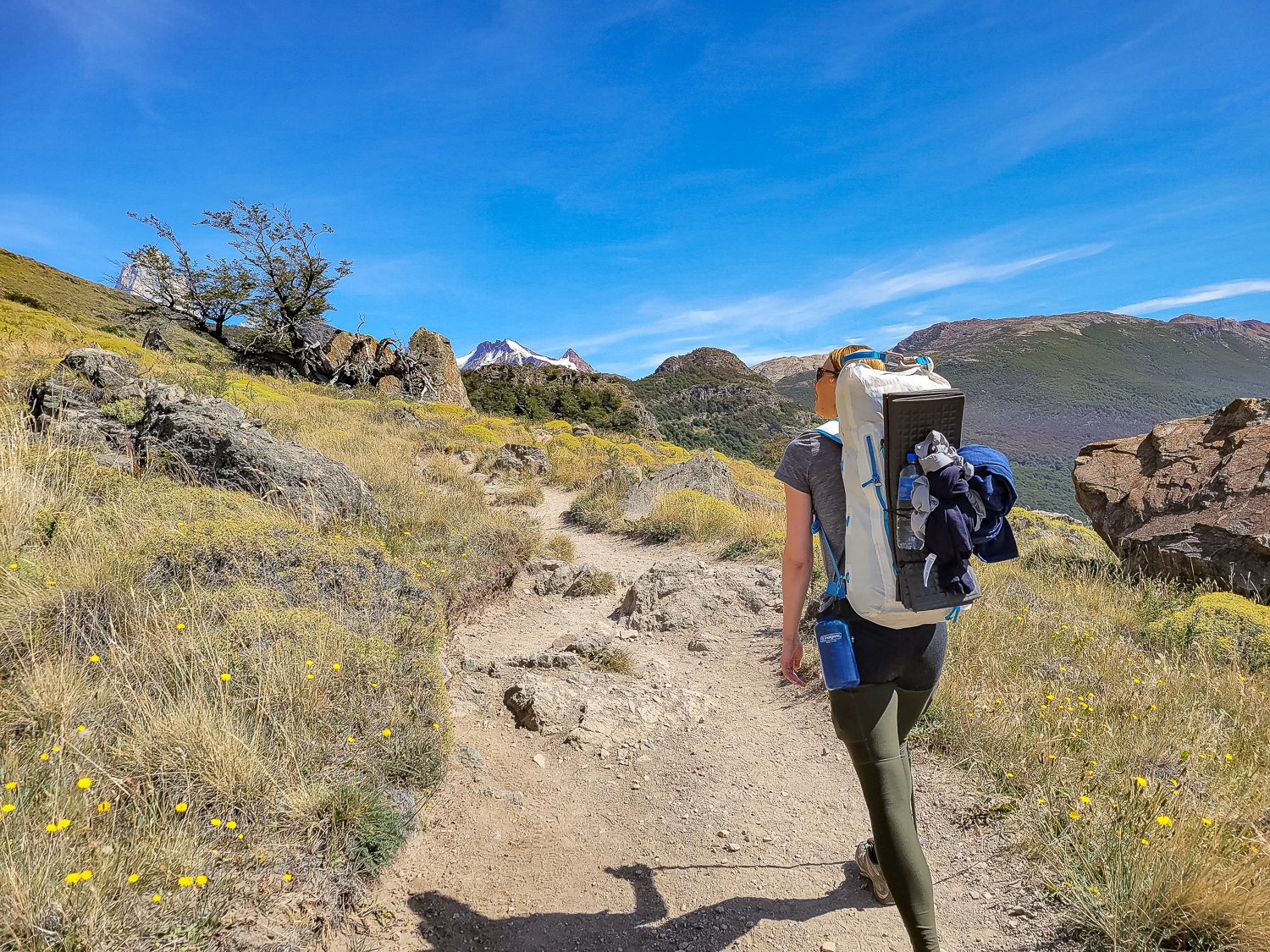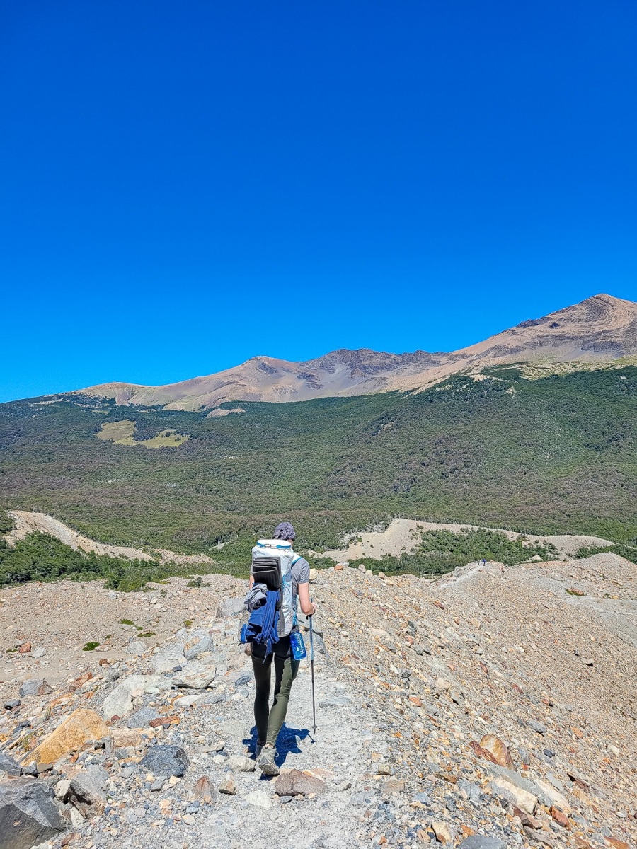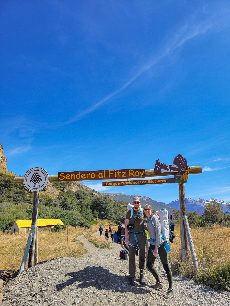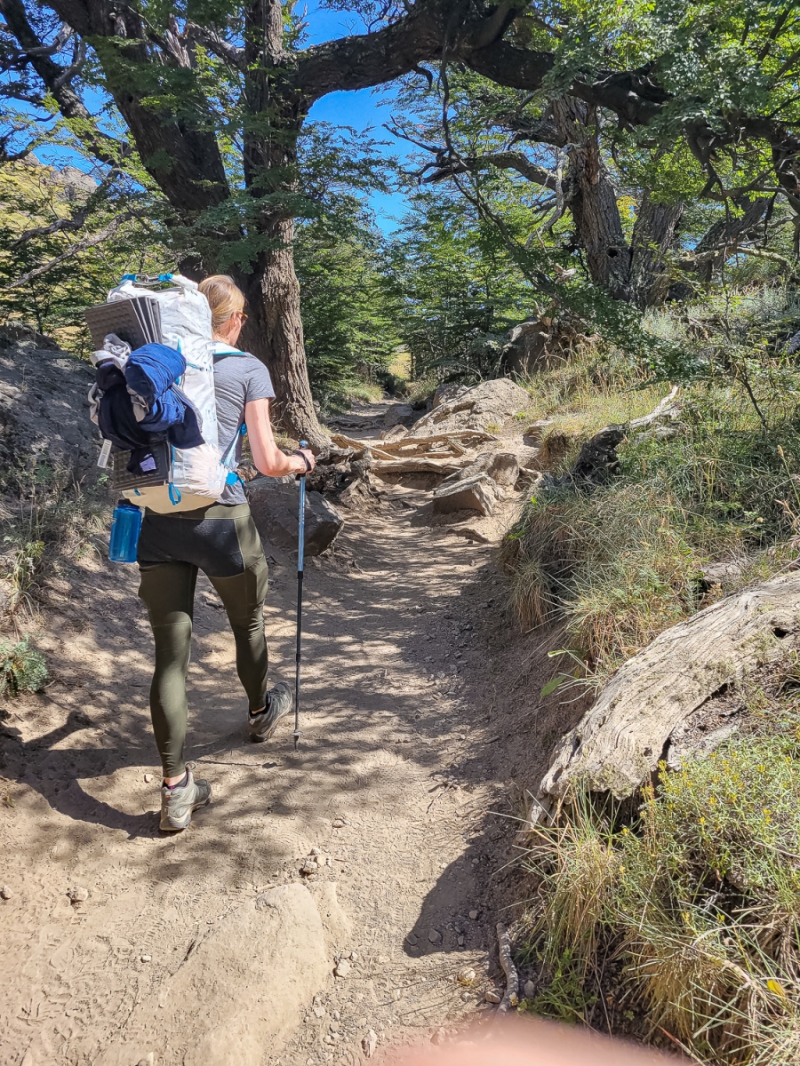 Nu var vi klar! Alt var pakket i de små 45l rygsække vi har med på rejsen til vandreture. Mad til 7 dage fylder godt i vores små tasker, så vi havde sparet på maden og havde kun det mest nødvendige med. Vi gik afsted ud af byen mod vandreruten, der leder op mod Laguna los de tres, som ligger ved foden af Fitz Roy bjerget. Et ikonisk smukt bjerg, som er mange bjergbestigeres drøm.
