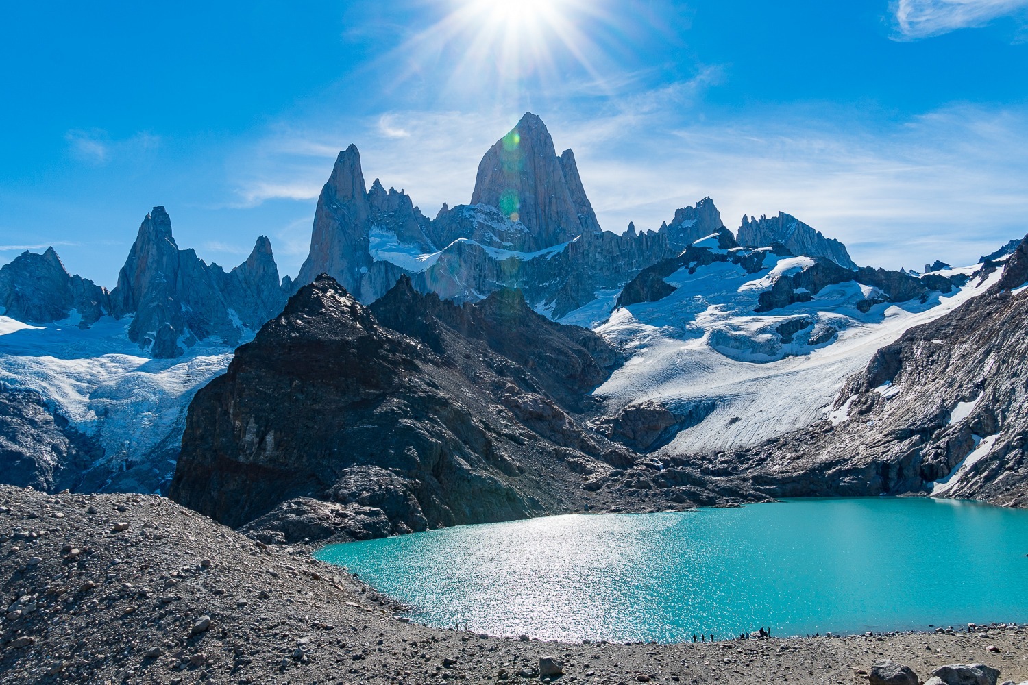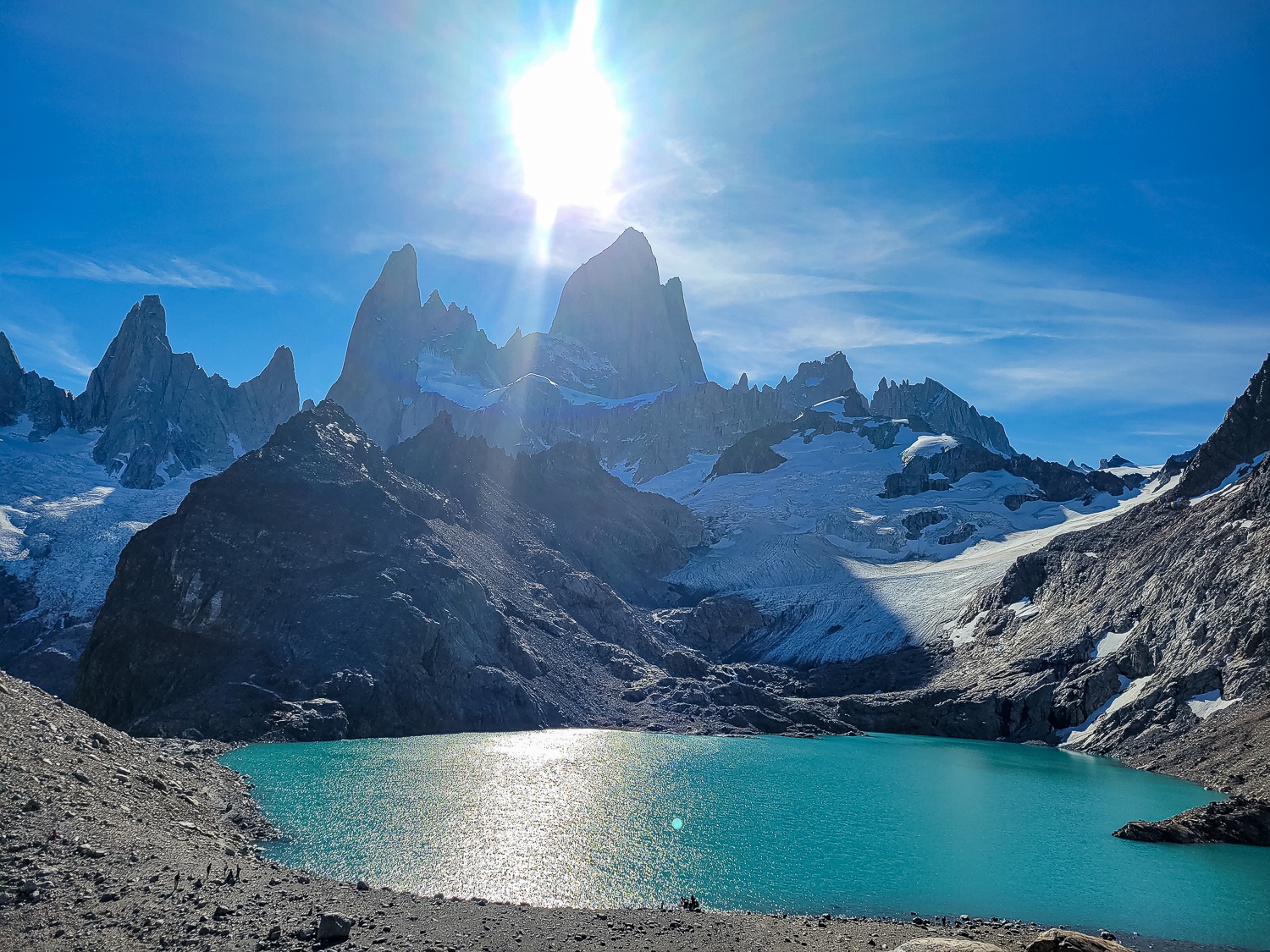 Vi ankom til lejrpladsen og der var flere mennesker end vi havde forventet. Måske 100 telte pakket sammen i den lille skov. Vi fandt heldigvis et sted nede ved floden, der var mindre befolket. Vi satte teltet op og vandrede videre op mod Laguna de los tres, som var små 500m op fra lejrpladsen, 1.5km stejlt opad, og da vi kom op til søen, stod solen lige over bjergene på fuld kraft, et smukt syn uden lige.