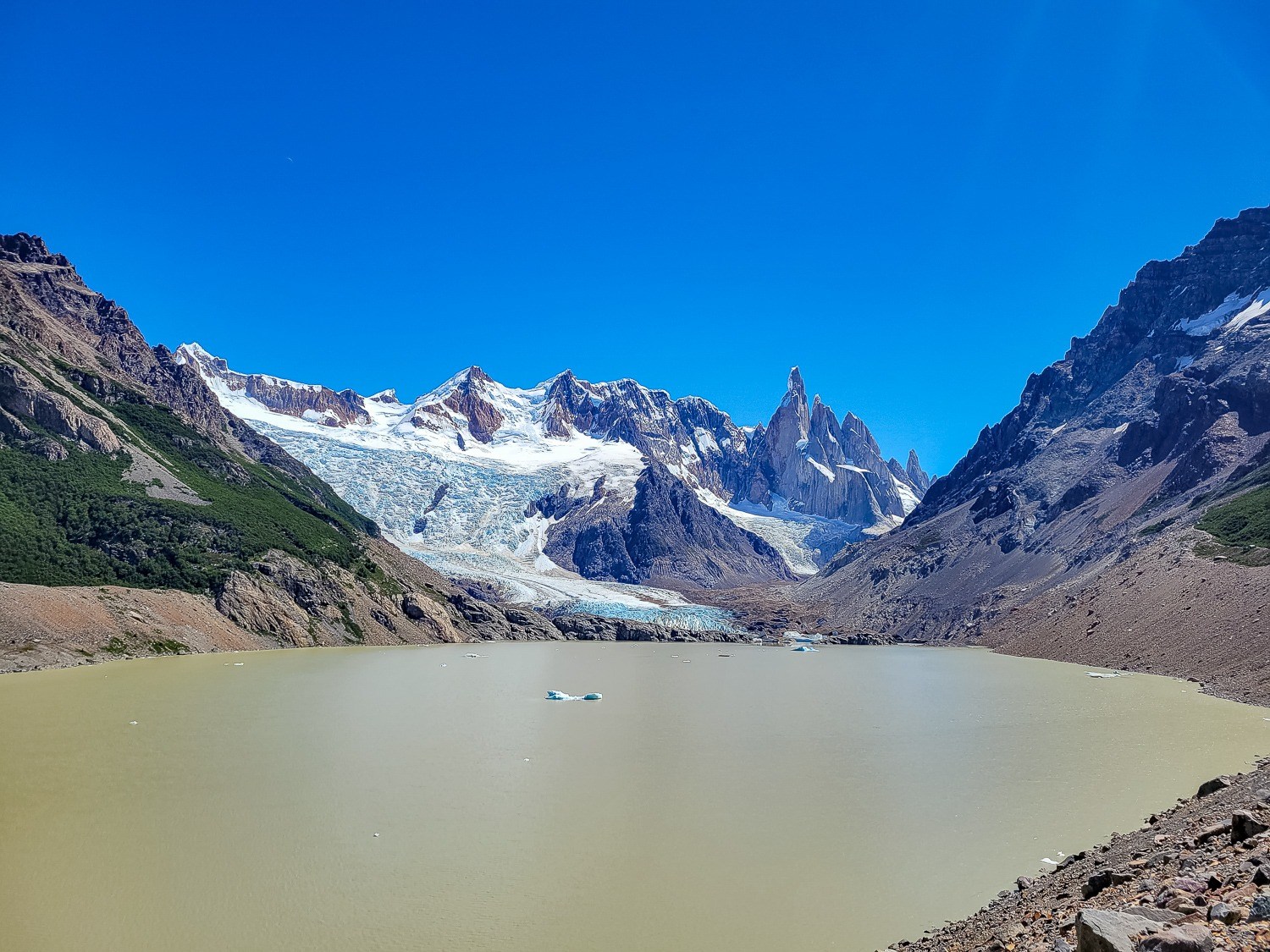 Herfra gik vi mod gletsjersøen ved Cerro Torre med endnu en utrolig smuk udsigt til bjergene. Ved floden fra gletsjeren kunne vi slå vores telt op og det gjorde vi. Vi havde nogle timer til aftensmad, som vi brugte på at slappe af ved teltet. Vi havde taget støvlerne af, så fødderne kunne få lidt luft. Uheldigvis var en af de giftige larver, der lever oppe i bjergene i området, havnet i Katjas støvle uden vi havde set det, så da Katja skulle have støvlen på igen lød det er skrig og Martin fik et chok. Straks fik vi renset de små brændende sår og spurgte to gutter ved lejren om laverne var farlige. Det mente de ikke, men de godt kunne stikke med deres pigge. De små sår faldt hurtigt til ro og Katja var ok.