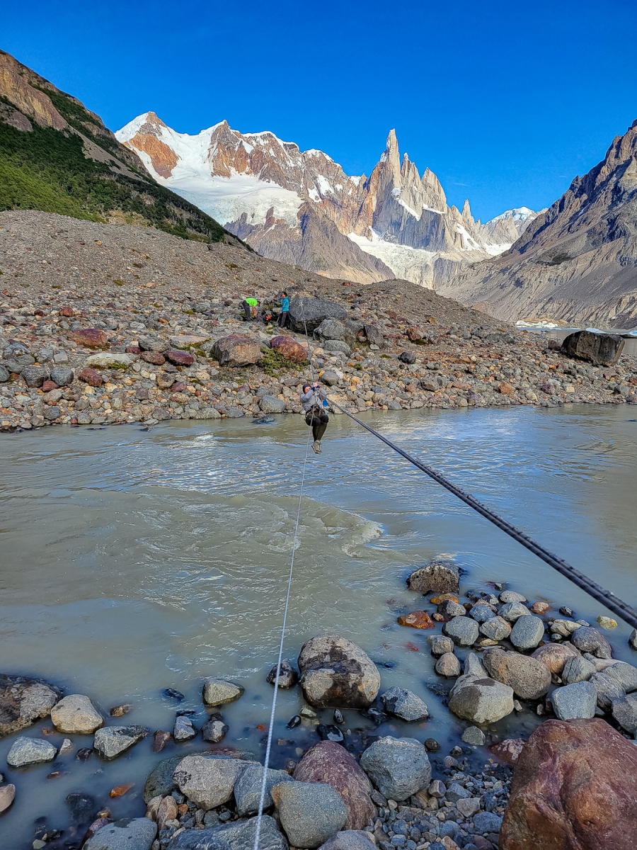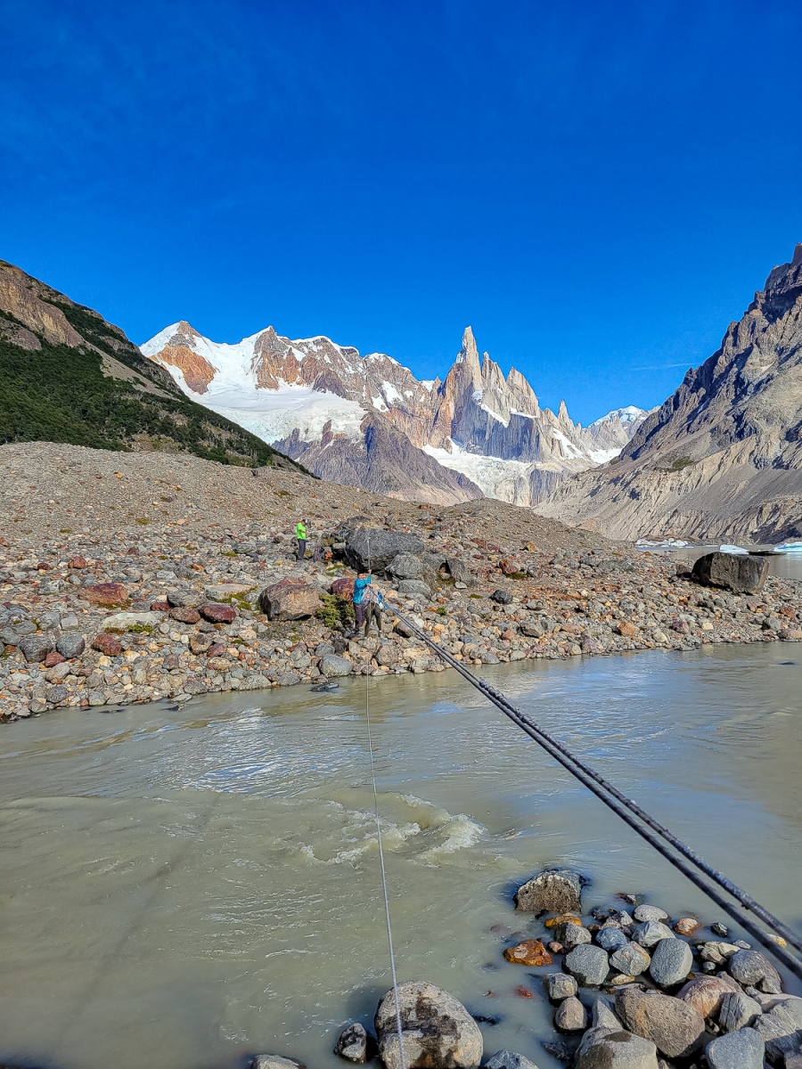 Næste morgen var det dagen med det store bjergpas uden for ruten. Dette stykke var et stykke af vores sammenstykkede rute, som ikke var markeret på kortet og vi skulle derfor selv navigere over passet, men først skulle floden Rio Fitz Roy krydses. Vi fik udstyret på og Katja skubbede sig først over floden hængene på det slidte reb. Det var en lidt af en opgave at skubbe sig selv over floden, hængende der over floden med et reb, der havde set bedre dage og en taske der skulle skubbes og trækkes med over, men Katja var hurtig ovre på den anden side og efter en lille kamp med at komme ud af selen var det Martins tur til at trække sig over.