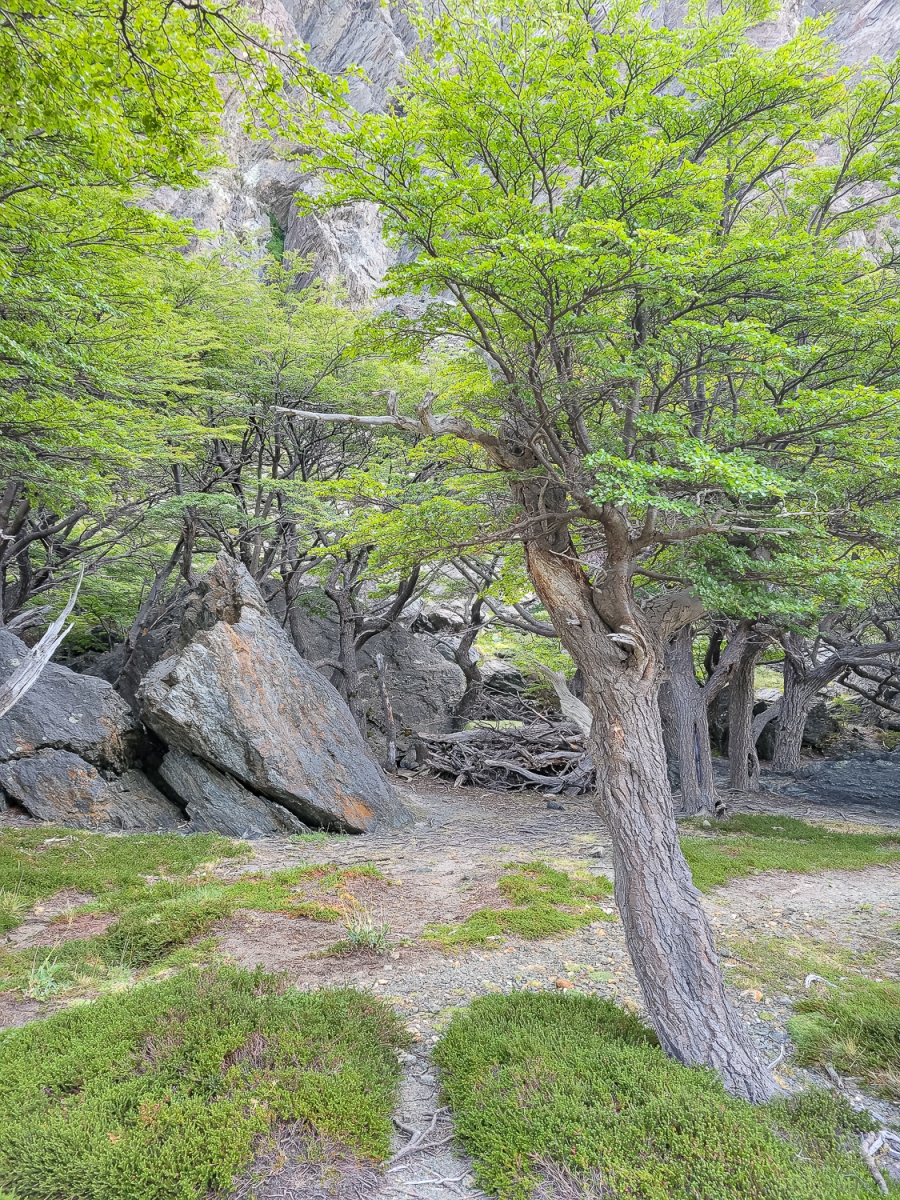 Stien gik direkte opad og sådan blev den ved hele vejen op til lejrpladsen. Det er en smuk rute hvor man kommer gennem skov og hede landskab. Lidt over halvvejs kunne vi vælge den direkte vej mod lejren eller den lidt længere vej med udsigt til bjergene. Vi valgte vejen med udsigt og blev ikke snydt, da vi pludselig stod med den smukkeste udsigt til Fitz Roy og de omkringliggende bjerge.