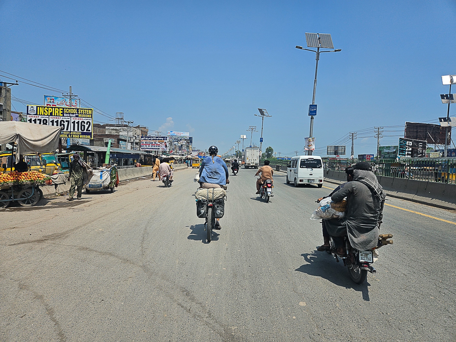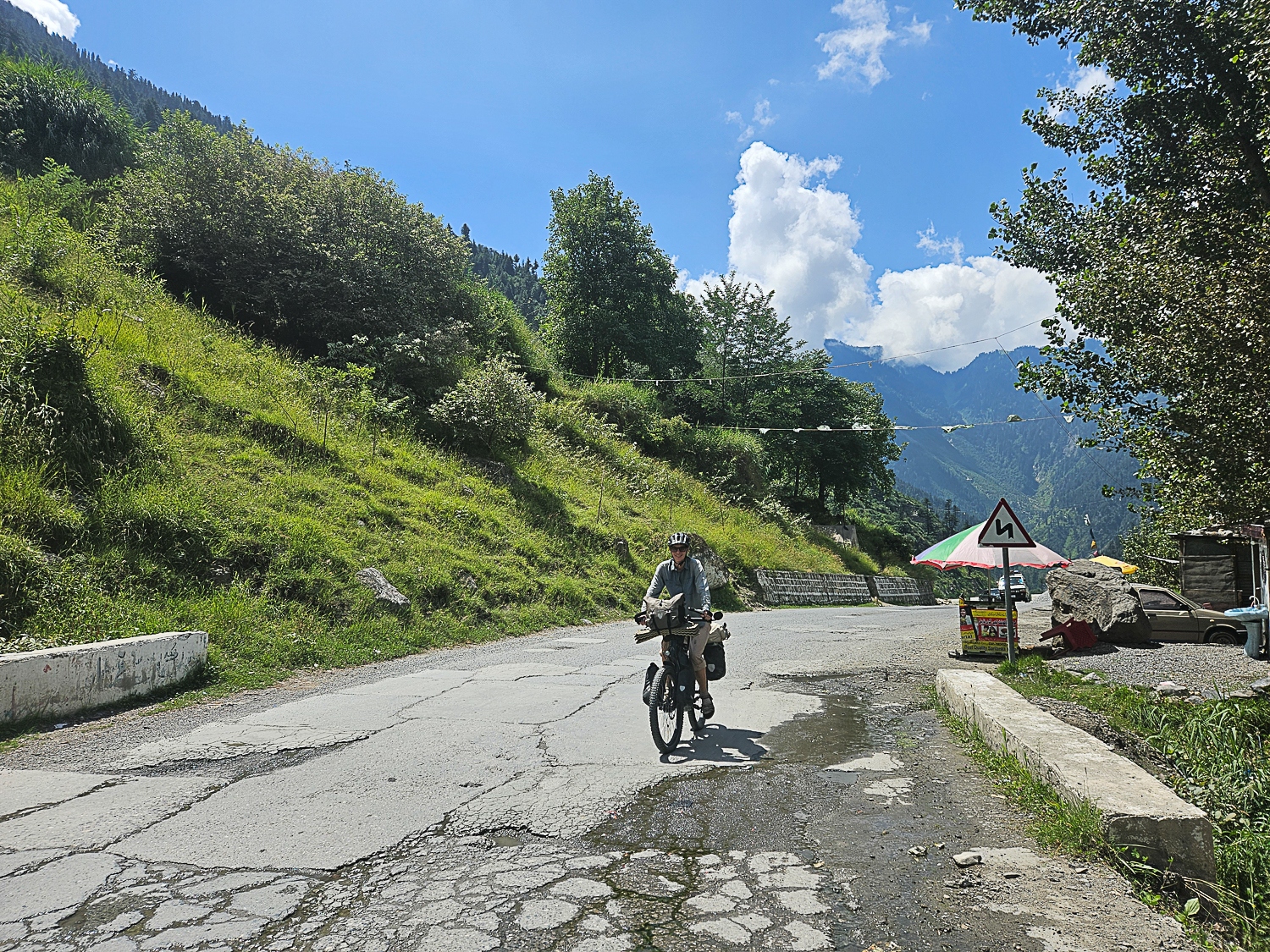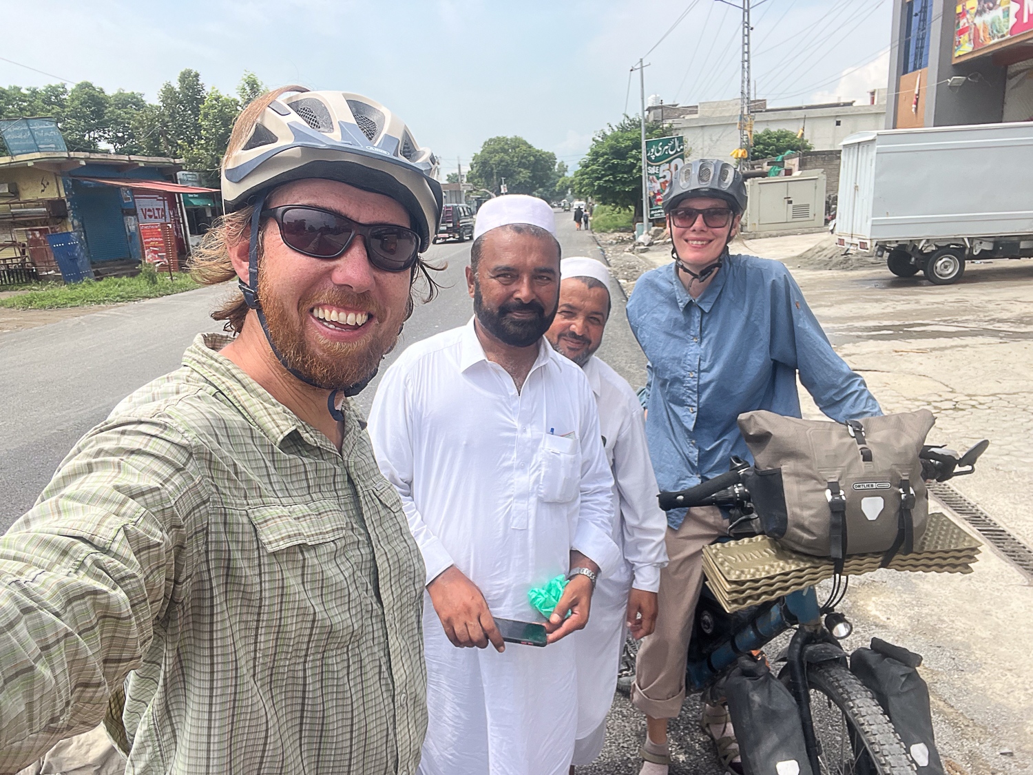 Efter en overnatning i Lahore cykler vi nordpå mod vores mål; Pakistans høje bjerge. Vi ærgrer os over at forlade charmerende, pulserende Lahore, men i august er vejret så varmt og fugtigheden så høj at det næsten er ubærligt. Varmen motiverer os til at cykle lange dage på op til 120 kilometer, men det bliver der sat en stopper for, da vi efter et par dages cykling får en slem madforgiftning. Vi er i Gujrat, en større by, hvor det aftenen forinden tog os flere timer at finde byens eneste hotel. Hotellet viste sig at være møgbeskidt; et ulideligt sted at være syg. Vi beslutter os for at vi ikke kan blive i Gujrat, og i en kraftpræstation får Martin arrangeret et lift med en minibus 175 kilometer til Islamabad. Det er en fire-timers lang, varm og ukomfortabel tur, men med kun ét stop for at kaste op. I Islamabad finder vi et hotelværelse, hvor vi kan komme os. 10 dages hvile og en antibiotikakur senere cykler vi videre.