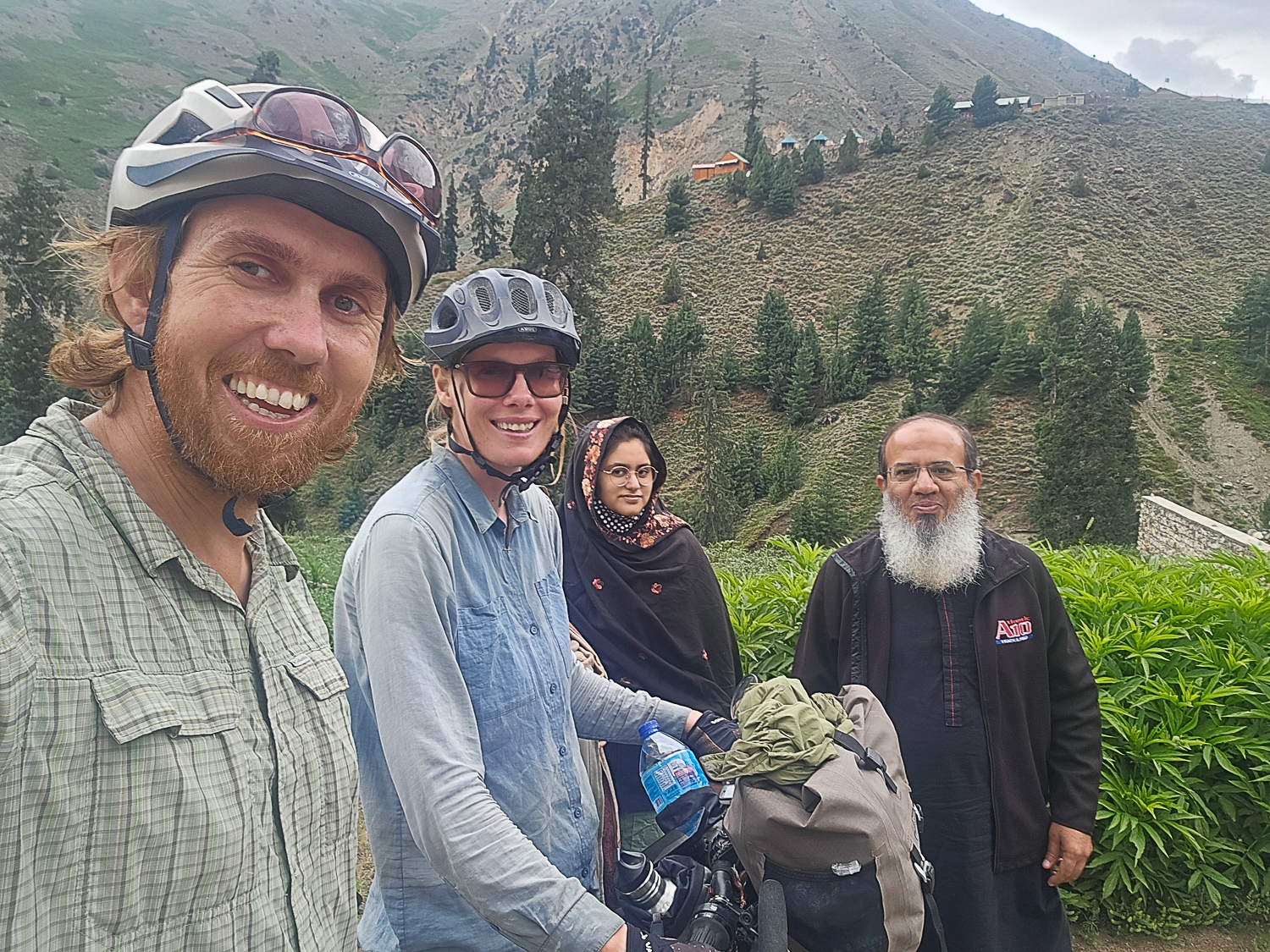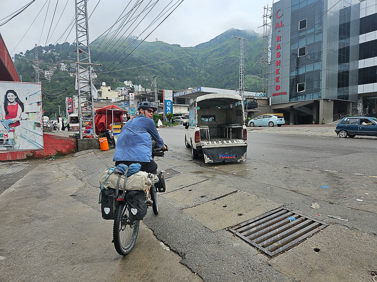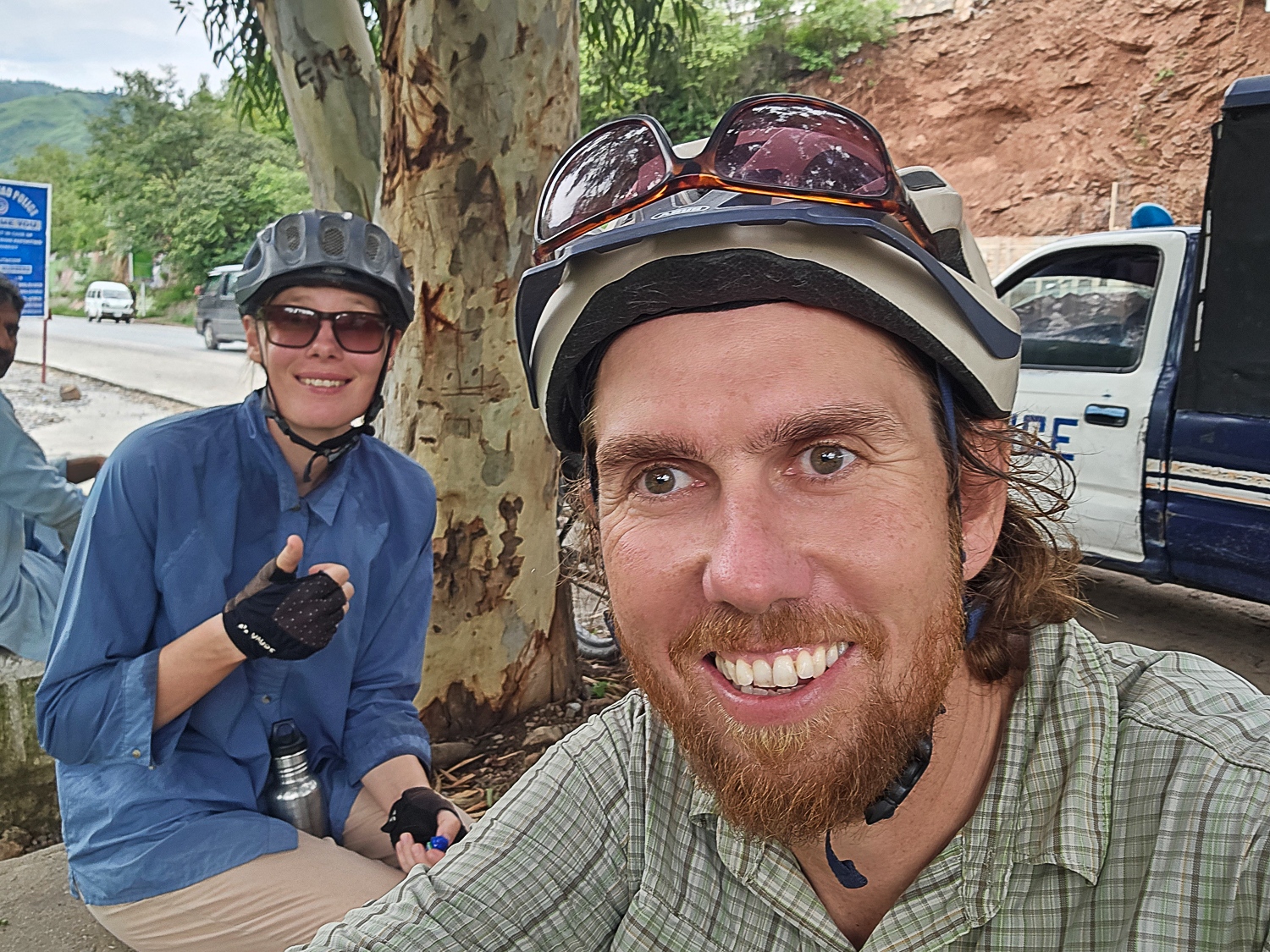 Længe før vi kom til Pakistan har vi drøftet, hvorvidt vi skal tage et lift fra Islamabad og de næste 500 kilometer nordpå til byen Chilas. På denne strækning får vi følgeskab af en politieskorte. Dermed går vi på kompromis med det vi elsker mest ved at rejse på cykel; friheden og mødet med lokale. Politimænd med AK47ere hængende over skuldrene er ikke et godt udgangspunkt for interaktioner med lokale. Men samtidig er vi stædige, og det betyder meget for os at cykle hele ruten. Vi har netop taget et 175 kilometers lift, og vi vil faktisk hellere cykle 500 kilometer, end vi vil sidde i en bus i 16 timer. Valget er taget, og vi cykler ud af Islamabad på en særdeles regnfuld dag. Monsunen er startet, og det gør os en anelse bekymret, for jordskred og oversvømmelser er normalen i Pakistan, som ifølge FN er et af de lande i verden, der er hårdest ramt af klimaforandringerne. Mens vi cykler mod Abbottabad, byen hvor Osama Bin Laden blev dræbt, undrer vi os over at politiet ikke har fået færden af os. Men efter et par timer venter to politimænd på os ved siden af vejen, resten af dagen følger de efter os på motorcykel. Fem kilometer før Abottabad bliver vi bedt om at vente på to andre cyklister. Efter en halv time ankommer to unge tyske mænd; Jonne og Johnny. De har brugt to dage på at flygte fra politiet. Vi synes det er spild af energi at modsætte os eskorten, og tager det i stedet som en oplevelse. Der er fut i de unge mænd, og politiet får grå hår af at skulle følge efter dem, samtidig med at have et øje på os. Vi har fortalt politiet, hvilket hotel vi vil bo på, og da de kører forbi gaden, hvor vi skal dreje af, er der ikke andet for os at gøre end at cykle hen til hotellet. Efter et par uger møder vi Jonne og Johnny, som fortæller os, at politiet opholdt dem i halvanden time, mens de ledte efter os. Det endte med at være os, som havde fortalt politiet hvor vi ville bo, der ”flygtede” fra politiet. Vi blev dog fundet om natten, hvor to politimænd indlogerede sig i værelset ved siden af vores.